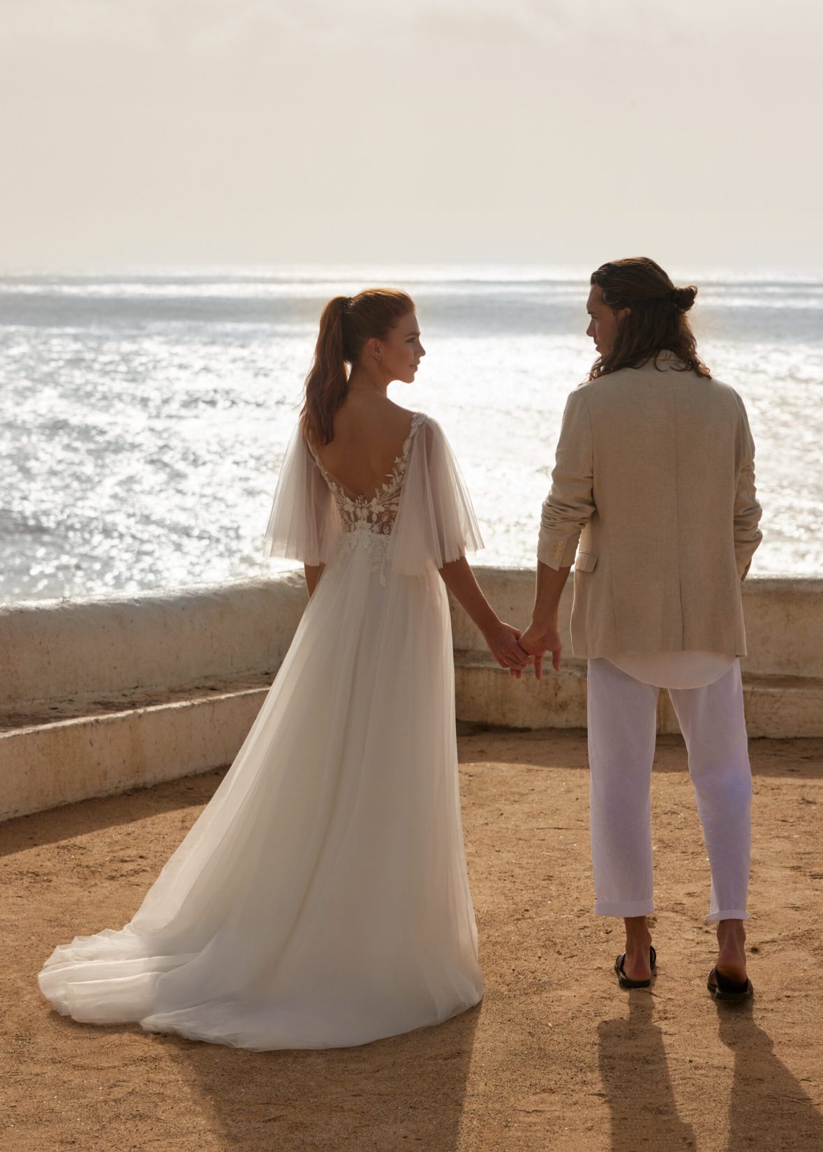 De Coral is een prachtige bohemian prinsessen trouwjurk. Met sterk 3D kanten lijfje en een tule rok met sleep.